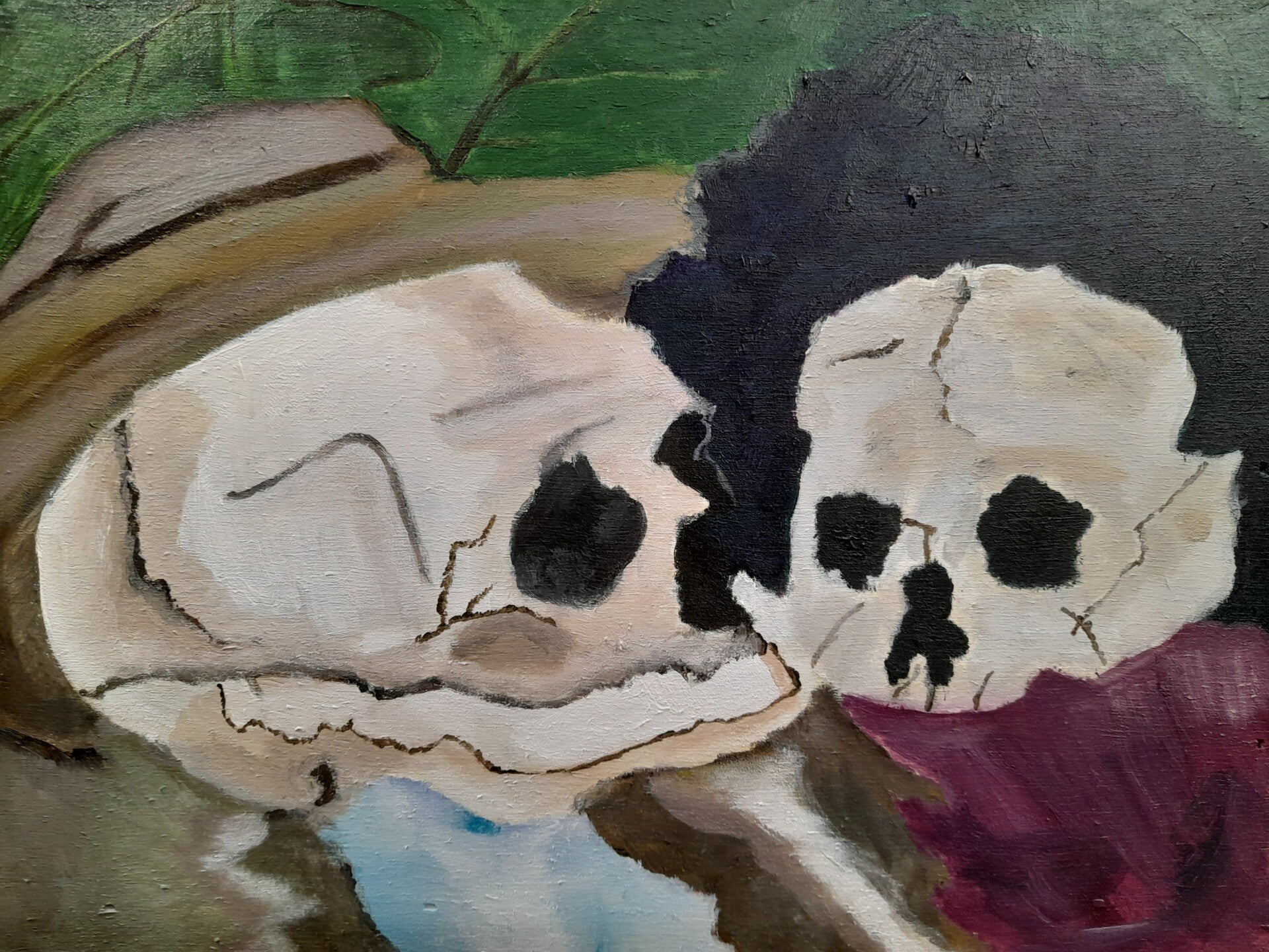 Het schilderij, dat twee menselijke schedels afbeeldt, is een confronterende Memento Mori dat direct de traditie van Ensor oproept. Net als bij Ensor, die humor en macabere elementen gebruikte om de menselijke kwetsbaarheid en hypocrisie te tonen, stelt dit werk de eindigheid van het menselijke leven centraal.