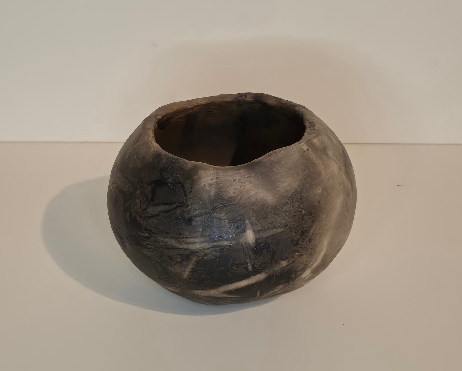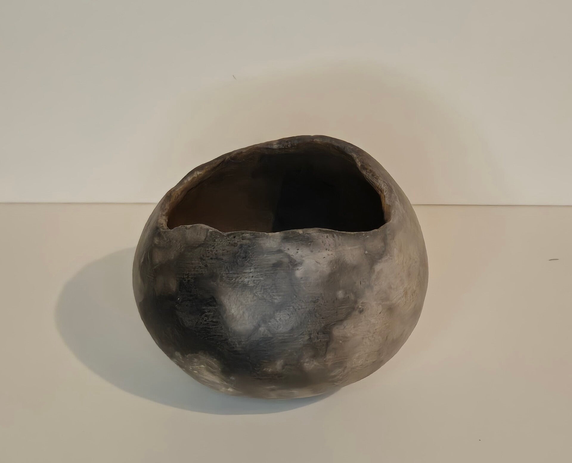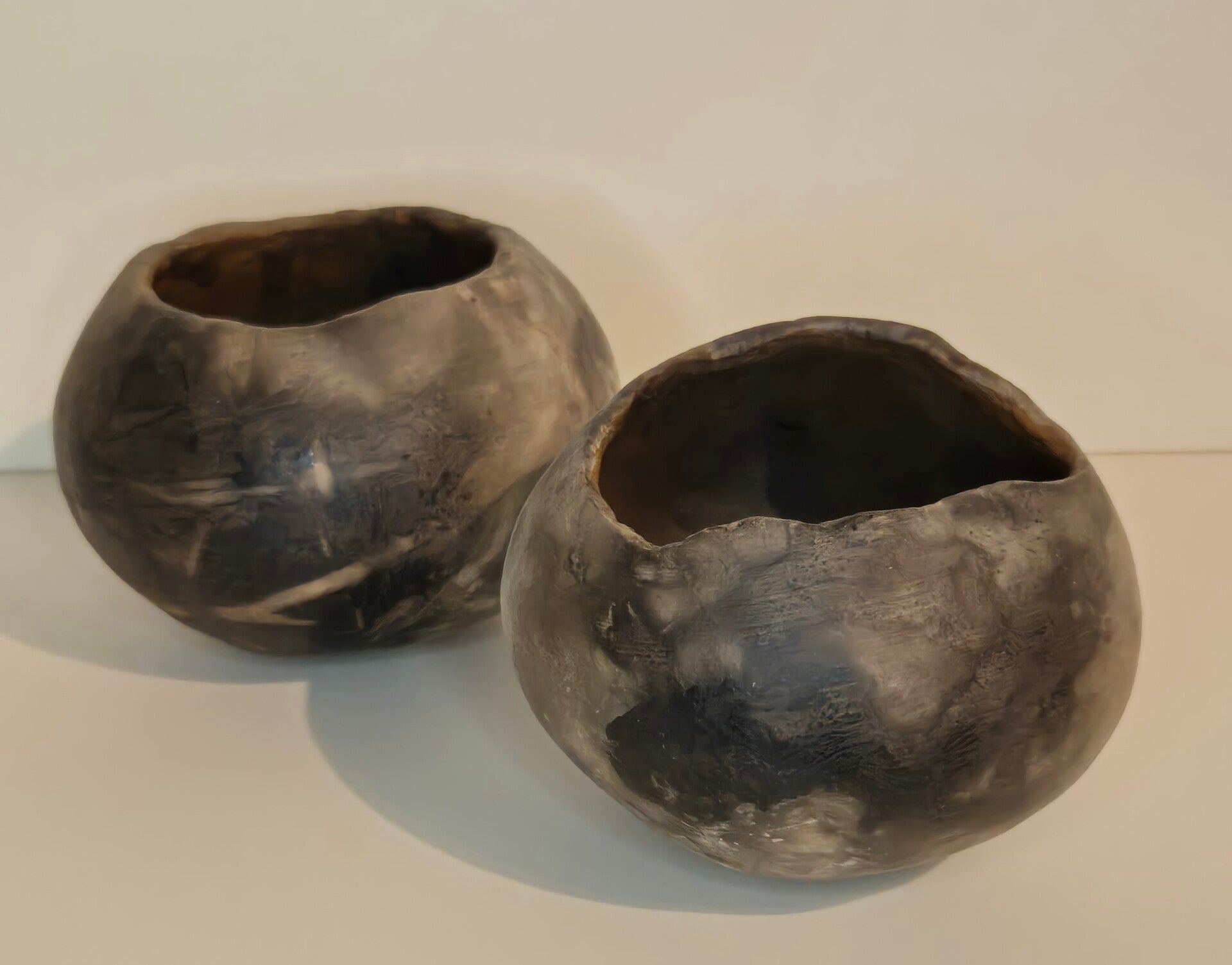 Deze twee objecten zijn onlosmakelijk met elkaar verbonden, maar hebben elk een eigen identiteit. De diepe, donkere rookpatronen en de zachte, mistige grijstinten vloeien over de ronde vormen als een abstract landschap. De asymmetrische, natuurlijk ogende randen benadrukken dat elk stuk met de hand is opgebouwd.